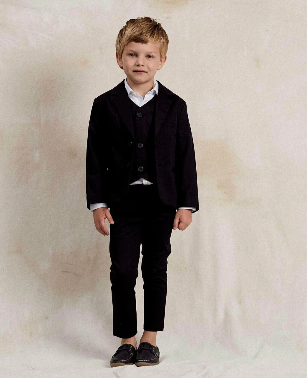 Traje confeccionado en gabardina esmerilada, este es un tejido de algodón suave al tacto pero a la vez muy resistente.
