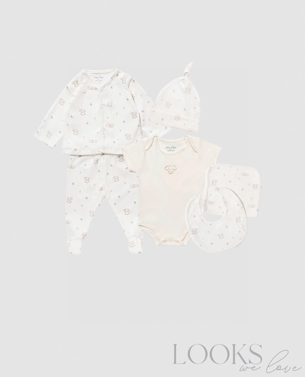 El conjunto se compone de un body con cuello americano, práctico para vestir o retirar hacia abajo, con broches en la entrepierna que facilitan el cambiado. Se suma un saquito con cuello en V con broches a presión en el frente, acompañado por un pantalón con pies y cintura elastizada que asegura comodidad en cada movimiento. El gorrito con nudo ajustable permite regular su tamaño cuidando la comodidad del bebé, mientras que el set de babero y babita completa el look, pensado para acompañar los momentos de cuidado diario.