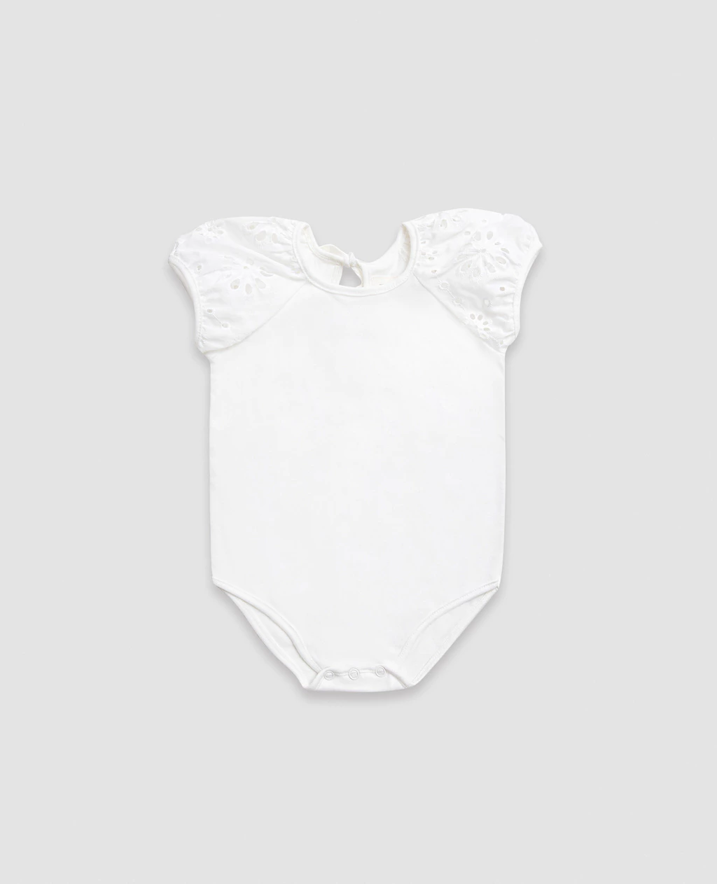 Body confeccionado en jersey 100% algodón que ofrece un tacto suave y agradable en contacto con la piel. Su diseño cuenta con mangas abullonadas confeccionadas en broderie calado y bordado con motivos florales, que le da un toque romantico y delicado. Para facilitar su postura cuenta con gota en la espalda y lazos para anudar, junto con broches a presión en la entrepierna.