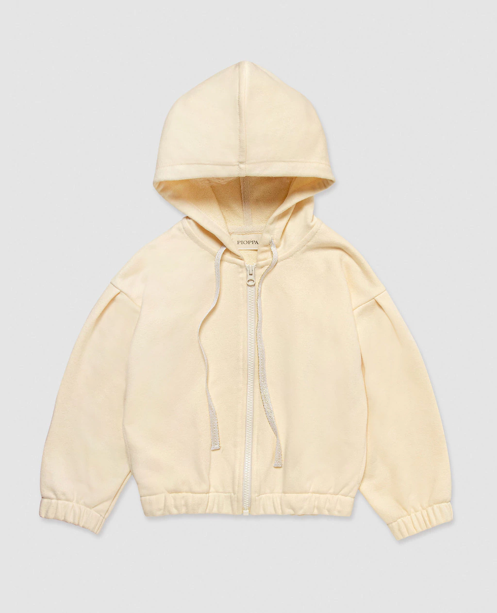 Buzo confeccionado en tejido rústico de 100% algodón. Es un modelo de corte holgado con sisas bajas y tablas en los hombros que aportan volumen a las mangas. Posee capucha con detalle de cinta de algodón con lurex y cierre metalico central. Tanto la cintura como los puños tienen elástico para un mejor ajuste.