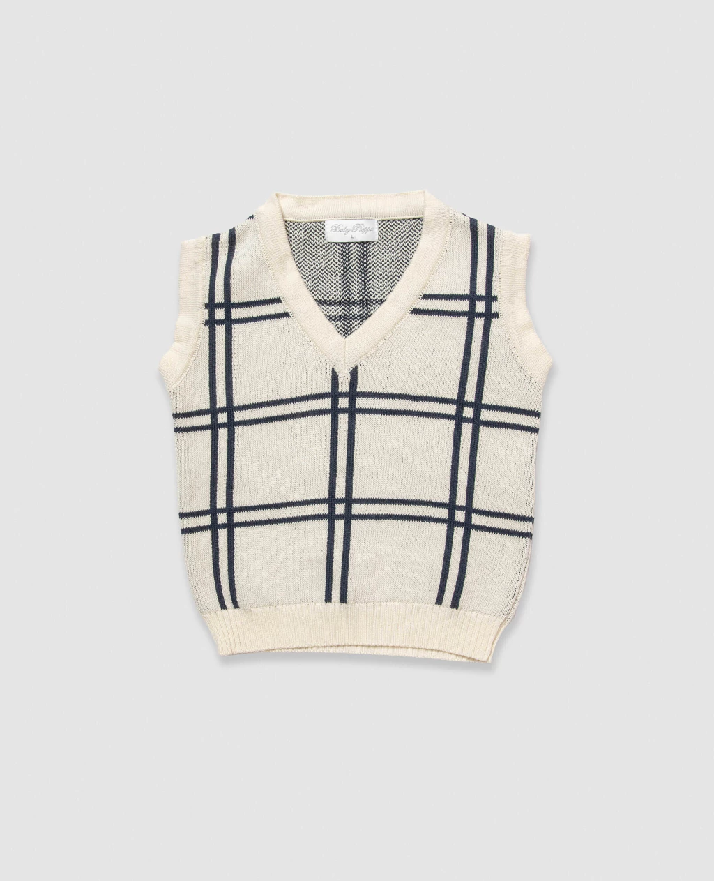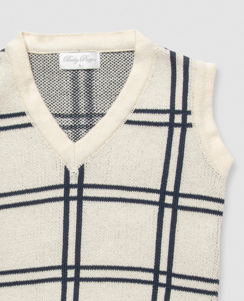 Chaleco confeccionado en hilo 100% algodón, tejido con la técnica jacquard que da vida a su diseño cuadrillé en contraste.