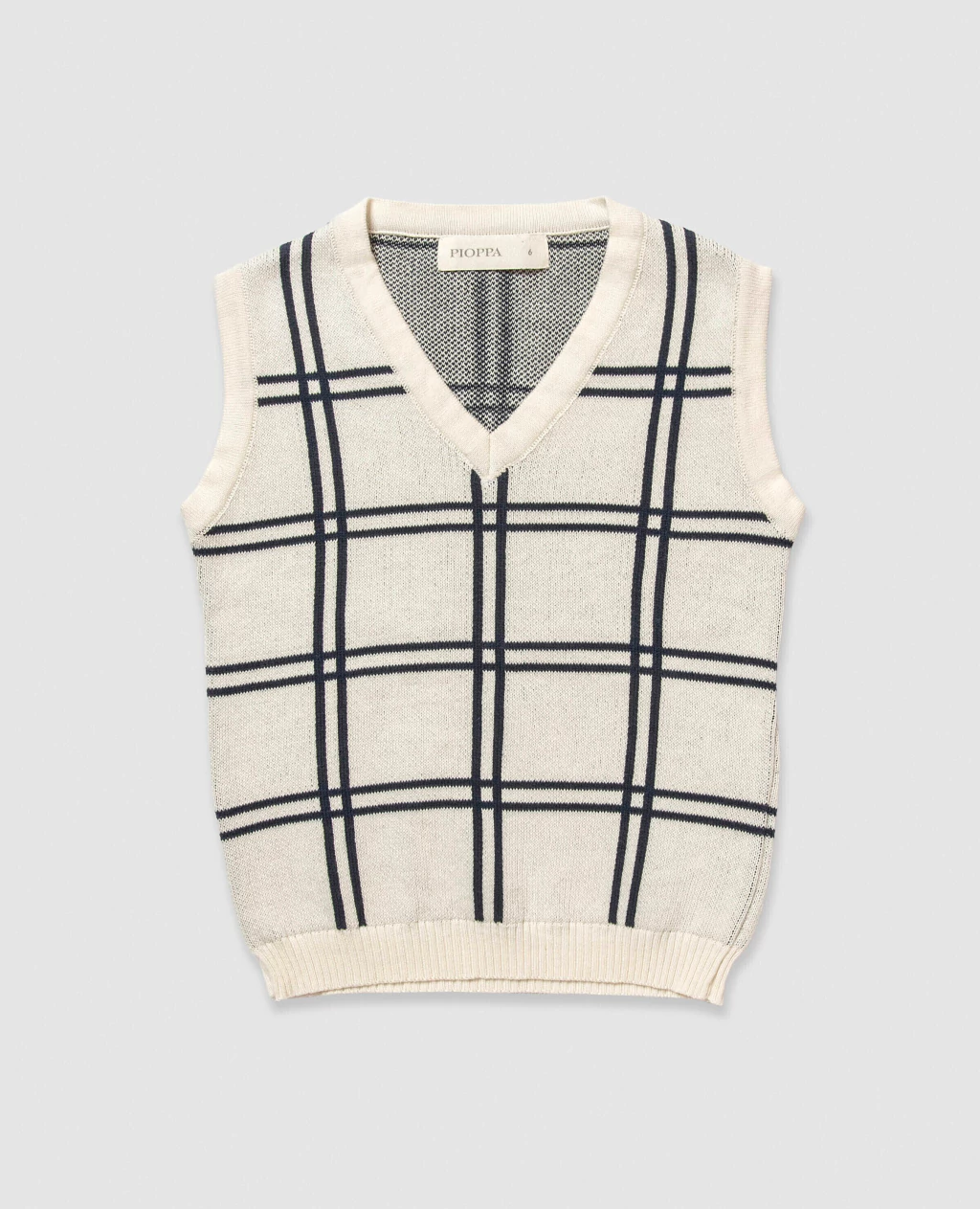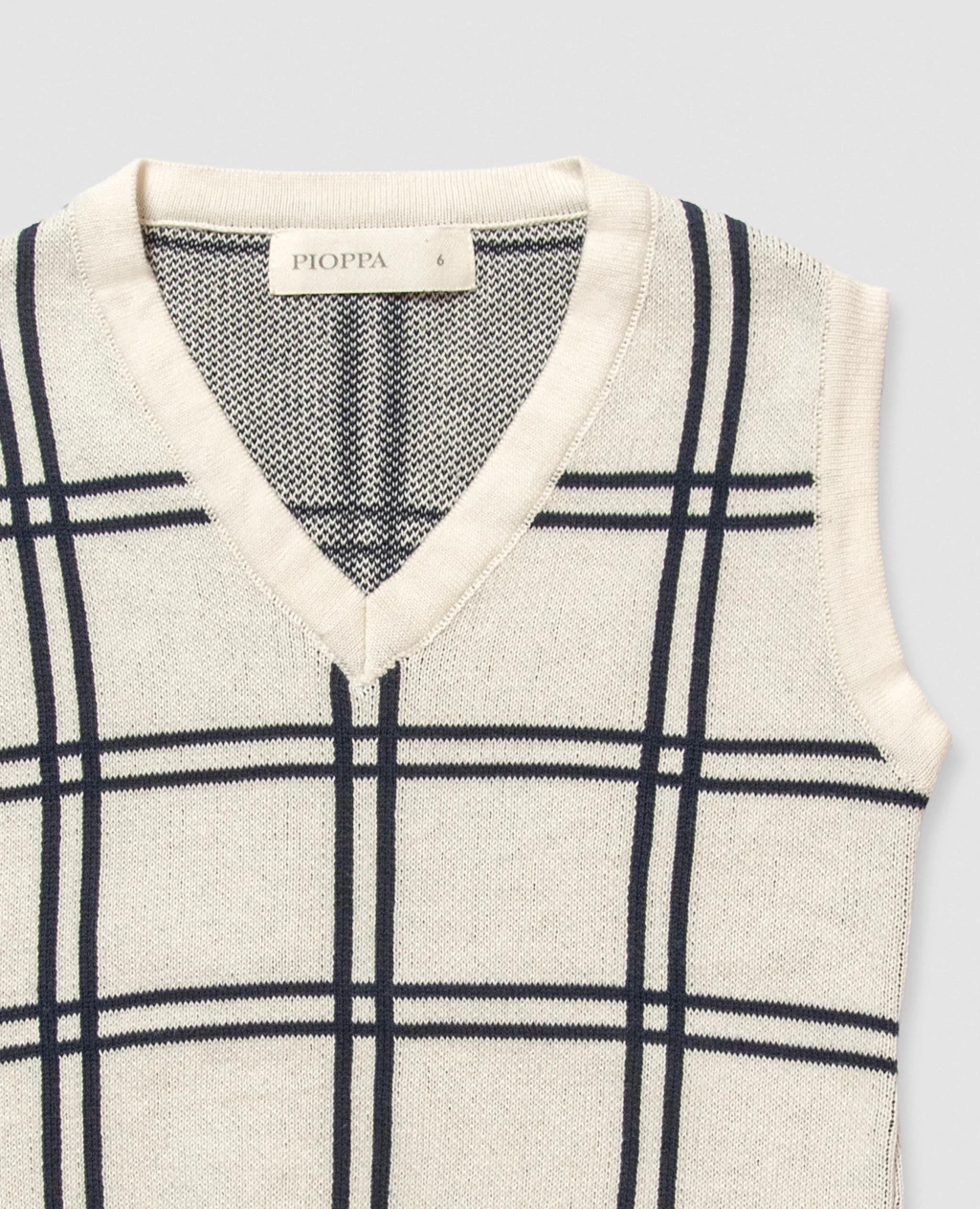 Chaleco confeccionado en hilo 100% algodón, tejido con la técnica jacquard que da vida a su diseño cuadrillé en contraste.