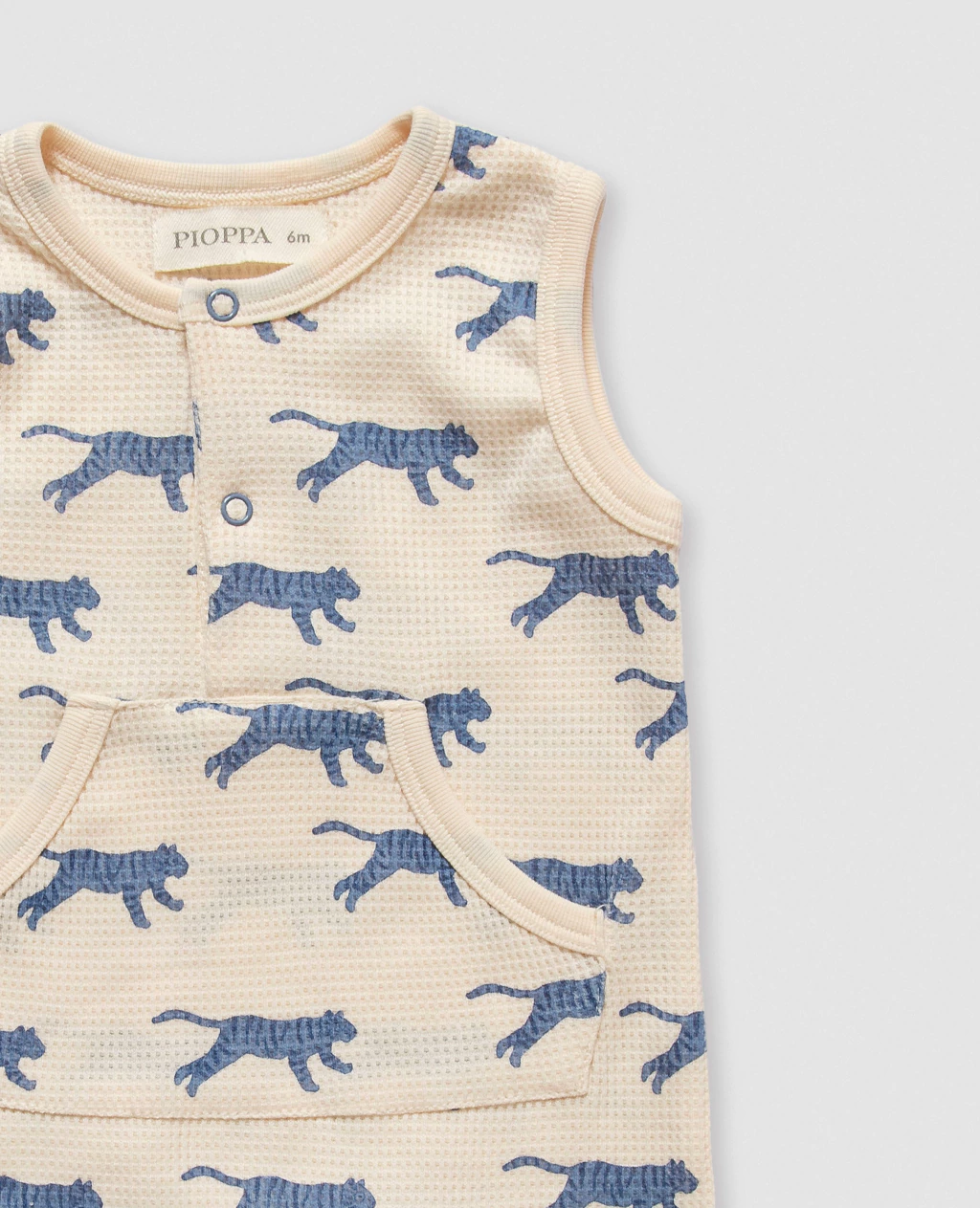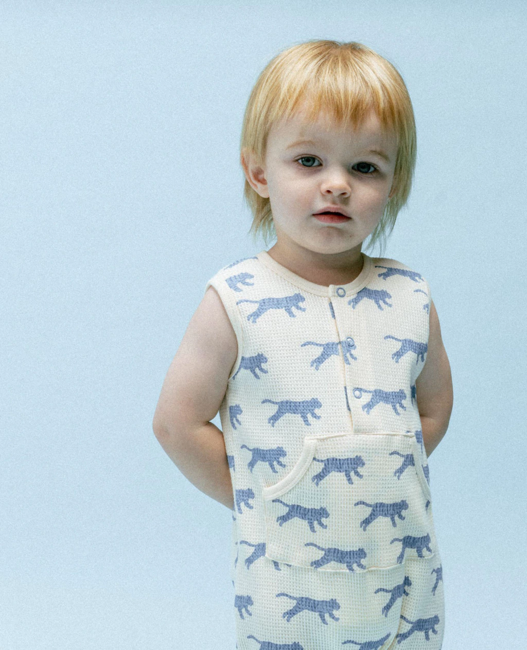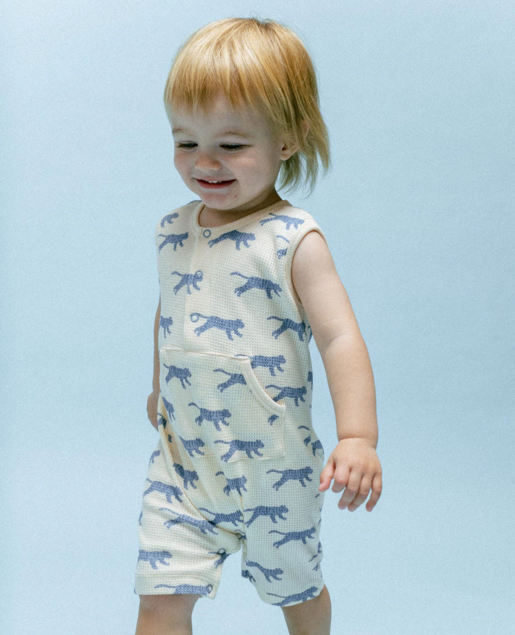 Enterito confeccionado en tejido panal 100% algodón, suave al tacto y con una delicada textura en relieve que recuerda a un panal de abeja.