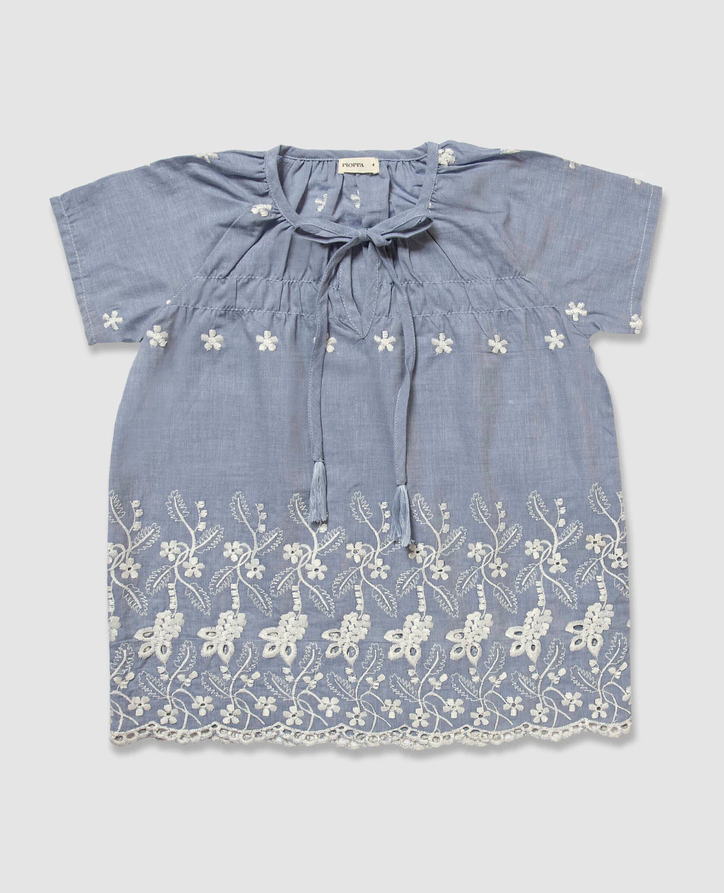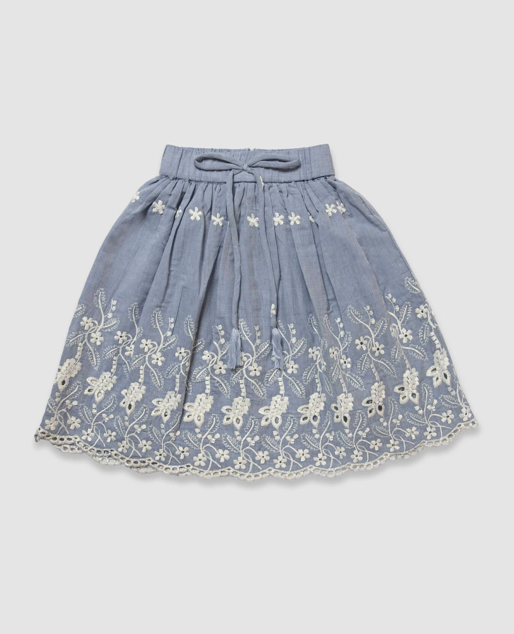 La camisa y la falda en voile se destacan por sus bordados florales exclusivos Pioppa, que recorren cada detalle con delicadeza y frescura.