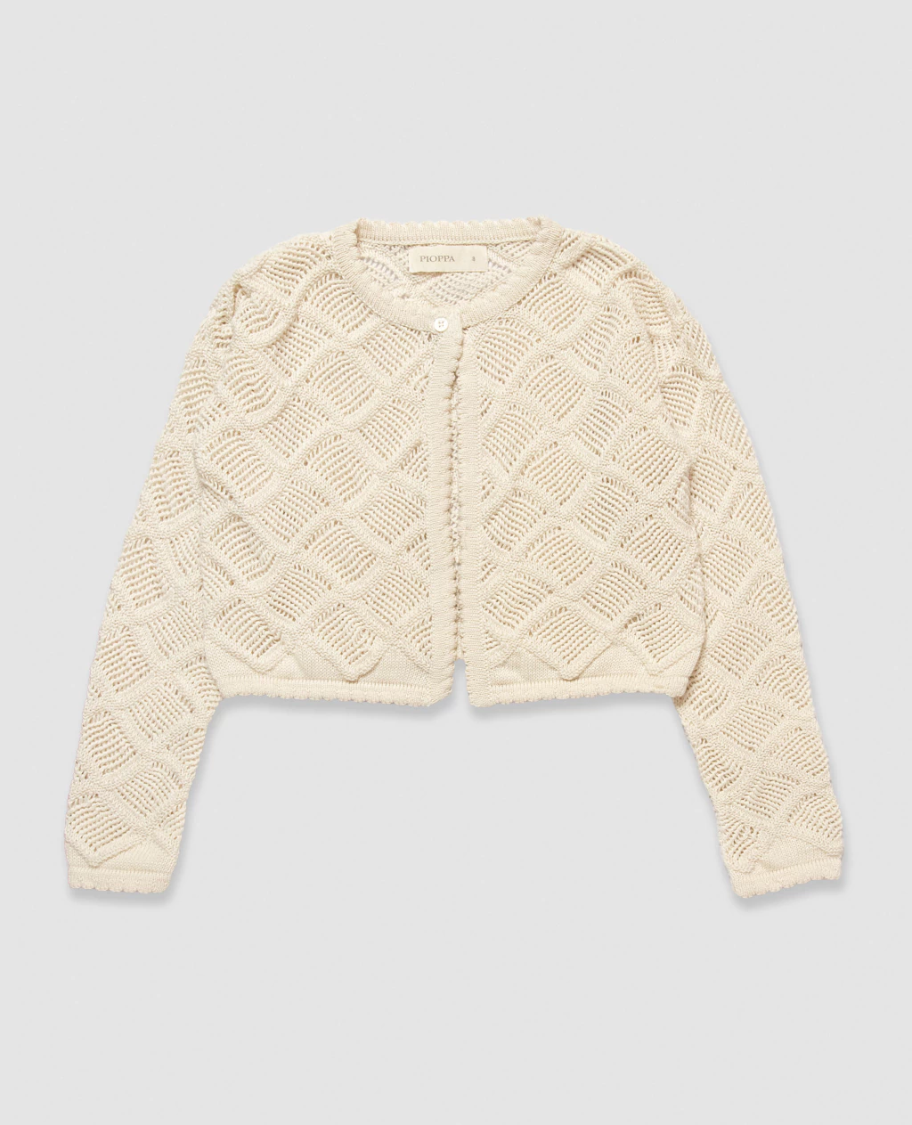 El conjunto se completa con la torerita tejida de calado artesanal, que suma un toque elegante y atemporal, logrando un conjunto lleno de dulzura y encanto.