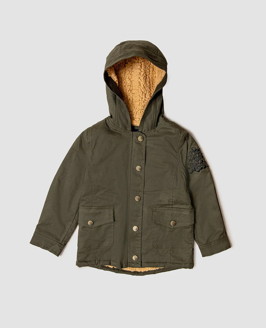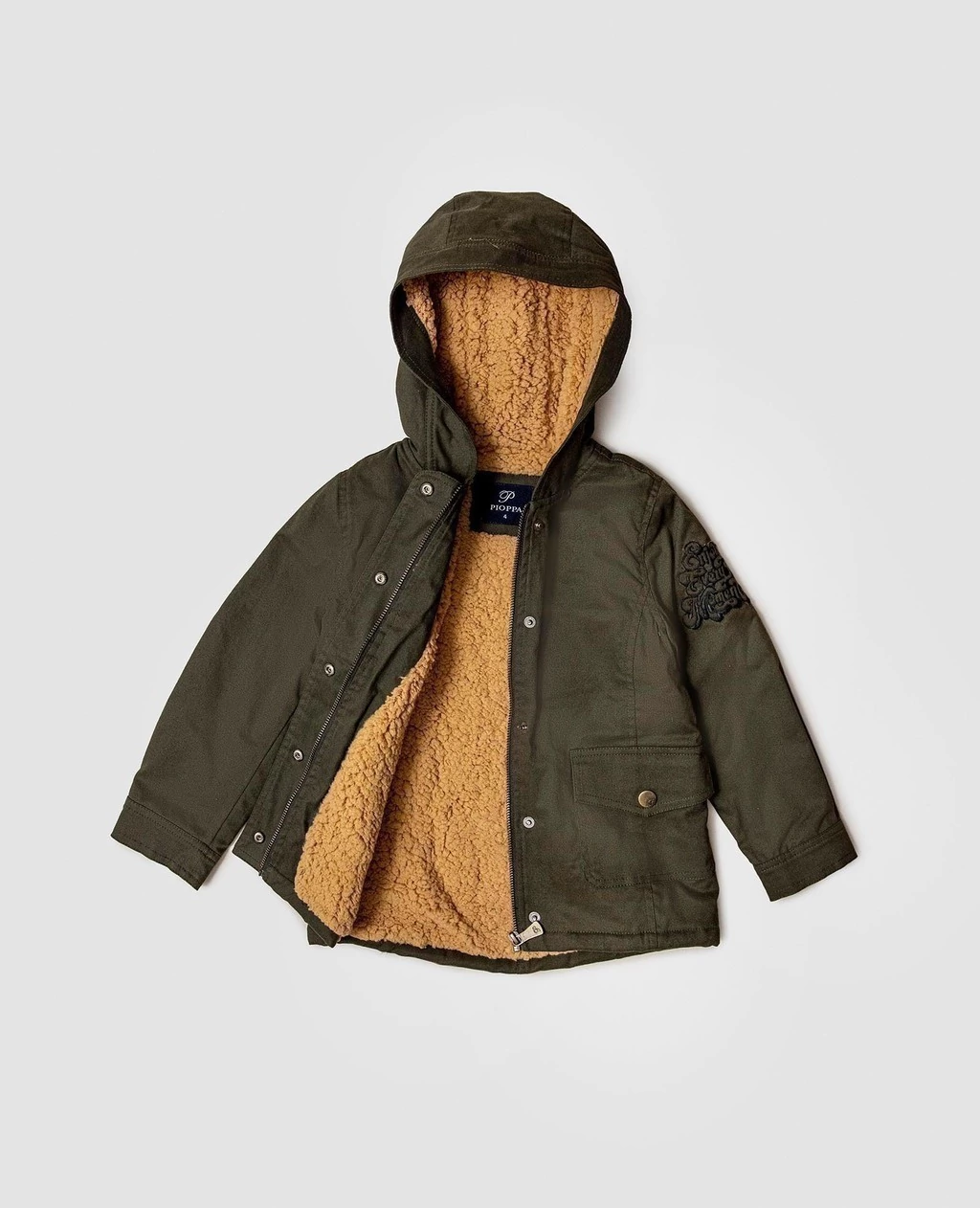 Parka confeccionada en gabardina con spandex. Este es un tejido de algodón suave al tacto, pero muy resistente a la vez, que al tener spandex pierde rigidez y brinda confort al uso. Es un modelo de corte recto forrado en corderito (excepto las mangas). El corderito se caracteriza por su textura peludita y por ser sumamente suave y cálido. Posee capucha, bolsillos aplicados y cierre metálico central cubierto por una solapa con broches metálicos a presión, esto se utiliza para lograr un cierre más hermético y así mantener la temperatura corporal. Todos los botones cuentan con el logo de la marca y sobre la manga izquierda, posee como detalle un bordado de diseño exclusivo Pioppa, con la leyenda "Enjoy every momento”.