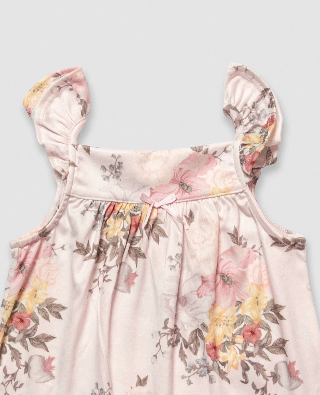 Con volados en los hombros y un delicado moño aplicado en el frente, se realza con una caída amplia y fluida que acompaña con dulzura cada movimiento.