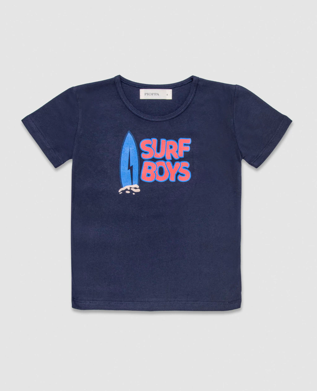 De diseño clásico con cuello redondo y mangas cortas, se distingue por su estampa exclusiva Pioppa “Surf Boys” en el frente, que aporta un aire fresco y divertido, inspirado en los días de verano junto al mar.