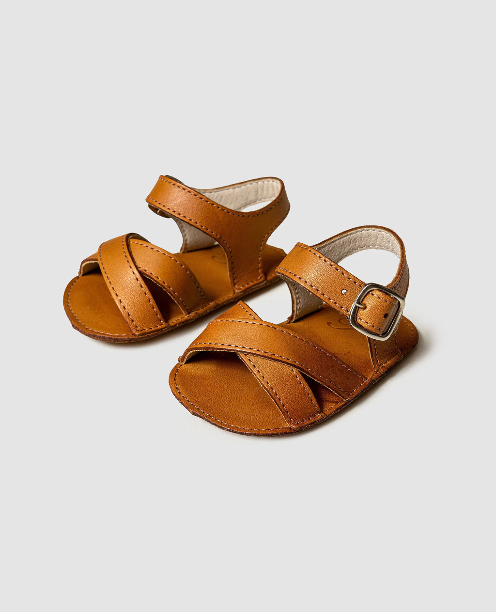 Sandalia de cuero. Posee dos tiras caladas que se cruzan en el empeine y pulsera con presilla metálica para poder regular su ajuste. La suela es de goma, que le proporciona una mejor flexibilidad y resistencia, además de ser antideslizante.
